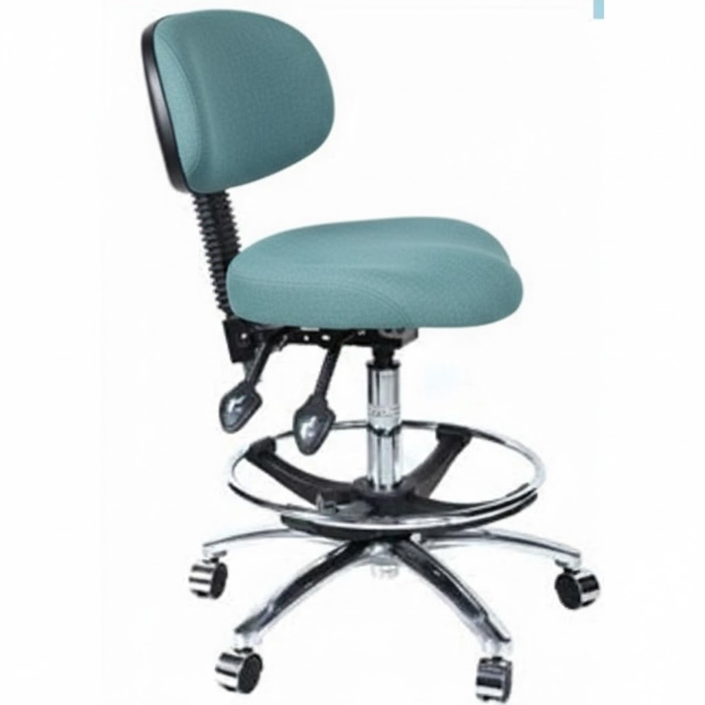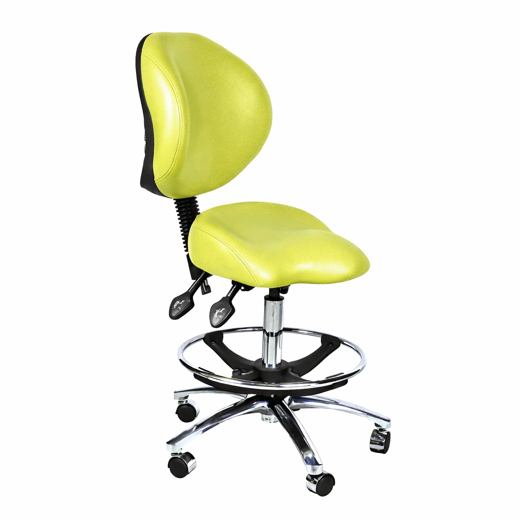The PRA04 stool features a compact design, ideal for spaces where room is limited. Its small backrest and contoured seat allow the operator to sit closer to the patient, while the seat design enables smooth swivel movement. The two-lever mechanism provides height adjustment and independent free-floating action for the backrest. The stool is also equipped with a foot ring and a taller gas lift for added comfort and support.